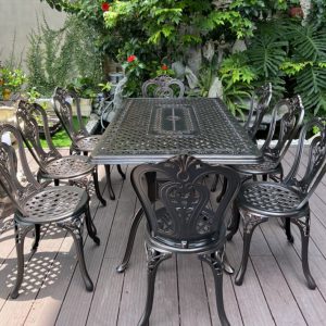 Bộ bàn ghế nhôm đúc ngoài trời gồm một bàn hình chữ nhật có kích thước 150*90*73cm và 6 ghế 45 *52*87cm cả bàn và ghế ngồi đều được thết kế mặt lỗ và các họa tiết hoa văn rất cân xứng và mềm mại để tạo nên một vẻ đẹp duyên dáng và nét sang trọng quý phái và thanh lịch… Kiểu dáng thiết kế độc đáo, ấn tượng trong các đường nét tỉ mỉ chi tiết giúp những mẫu bàn ghế nhôm đúc luôn được thu hút người xem từ cái nhìn đầu tiên, bàn ghế nhôm đúc khác hẳn với các chất liệu thông thường khác như gang sắt có thể bị gỉ, gỗ dễ bị mục. còn nhôm đúc là chất liệu được khắc phục cả hai nhược điểm trên, bàn ghế nhôm đúc có độ cứng cáp và bền bỉ chịu lực tốt không bị mài mòn hay gỉ sét trước thời tiết nhờ lớp sơn tĩnh điện cao cấp cùng với thiết kế chính xác, đã cho chúng ta thấy được khả năng chịu lực bền bỉ trước mọi tác động của thời tiết.