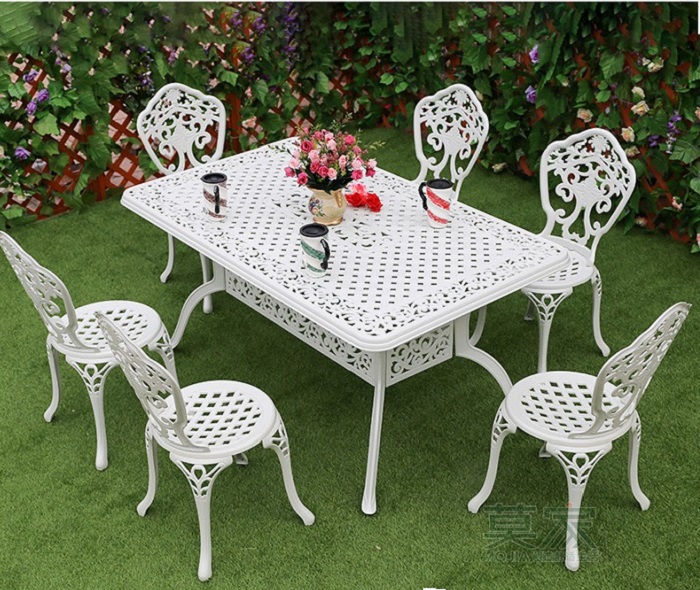 Bộ bàn ghế nhôm đúc ngoài trời gồm một bàn hình chữ nhật có kích thước 150*90*73cm và 6 ghế 45 *52*87cm cả bàn và ghế ngồi đều được thết kế mặt lỗ và các họa tiết hoa văn rất cân xứng và mềm mại để tạo nên một vẻ đẹp duyên dáng và nét sang trọng quý phái và thanh lịch… Kiểu dáng thiết kế độc đáo, ấn tượng trong các đường nét tỉ mỉ chi tiết giúp những mẫu bàn ghế nhôm đúc luôn được thu hút người xem từ cái nhìn đầu tiên, bàn ghế nhôm đúc khác hẳn với các chất liệu thông thường khác như gang sắt có thể bị gỉ, gỗ dễ bị mục. còn nhôm đúc là chất liệu được khắc phục cả hai nhược điểm trên, bàn ghế nhôm đúc có độ cứng cáp và bền bỉ chịu lực tốt không bị mài mòn hay gỉ sét trước thời tiết nhờ lớp sơn tĩnh điện cao cấp cùng với thiết kế chính xác, đã cho chúng ta thấy được khả năng chịu lực bền bỉ trước mọi tác động của thời tiết.