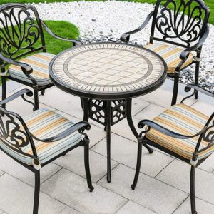 Bộ bàn ghế sân vườn nhôm đúc được làm bằng chất liệu nhôm đúc mặt lát gạch cao cấp khung bàn và ghế được phủ thêm hai lớp sơn tĩnh điện cao cấp. Chất liệu này không chỉ cứng cáp mà còn có khả năng kháng nước, kháng gỉ và hạn chế tối đa các tác động từ môi trường.