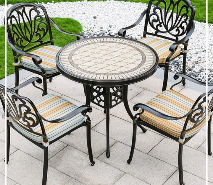 Bộ bàn ghế sân vườn nhôm đúc được làm bằng chất liệu nhôm đúc mặt lát gạch cao cấp khung bàn và ghế được phủ thêm hai lớp sơn tĩnh điện cao cấp. Chất liệu này không chỉ cứng cáp mà còn có khả năng kháng nước, kháng gỉ và hạn chế tối đa các tác động từ môi trường.