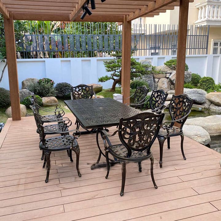 Bộ bàn ghế sân vườn ngoài trời này được làm từ chất liệu nhôm đúc phủ thêm một lớp sơn tĩnh điện cao cấp, chất liệu nhôm đúc này được xem như là chất liệu cao cấp nhất của ngành ngoại thất, nó nhẹ nhàng, bền bỉ có thể đặt ở mọi không gian khác nhau.
